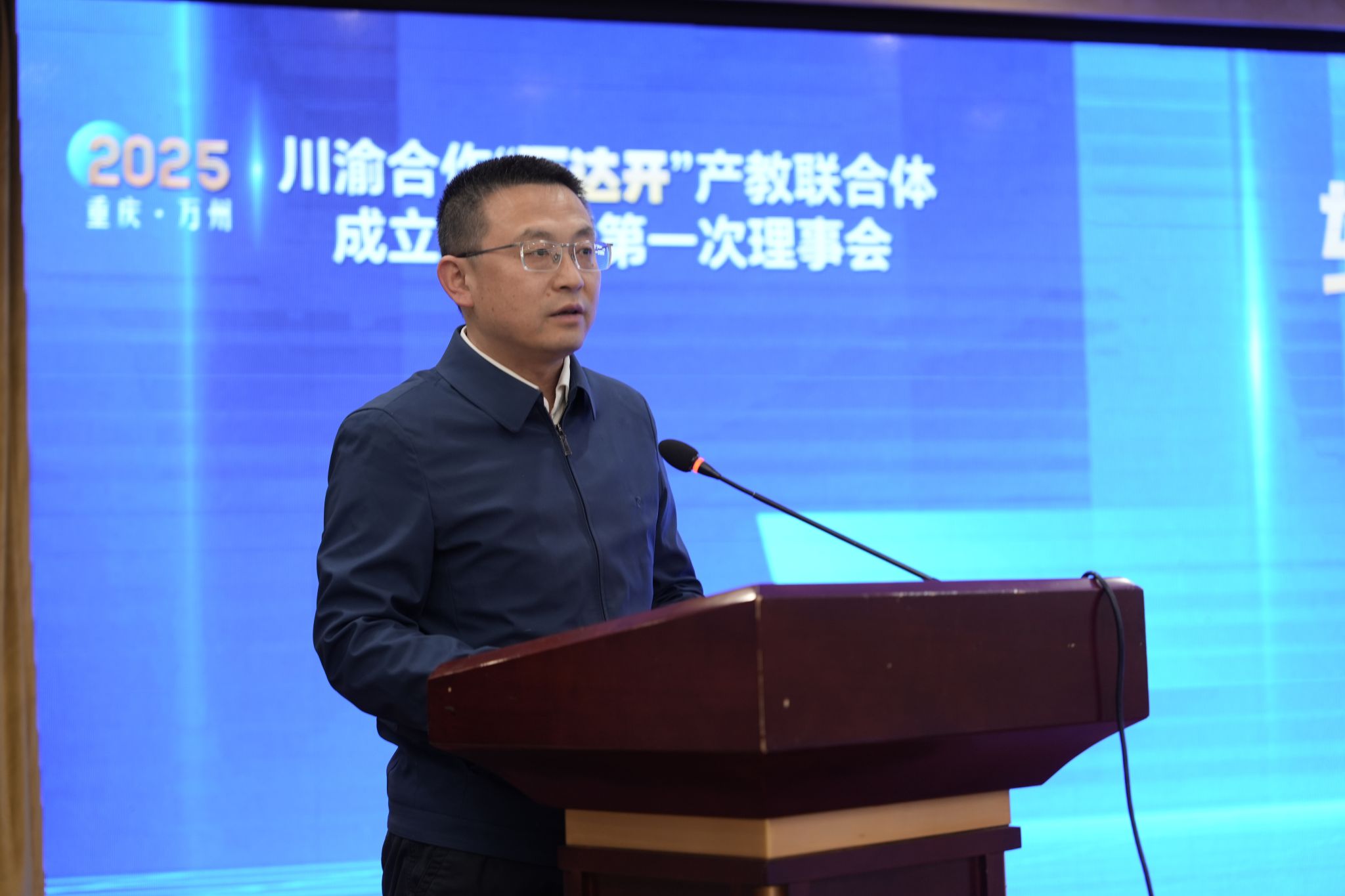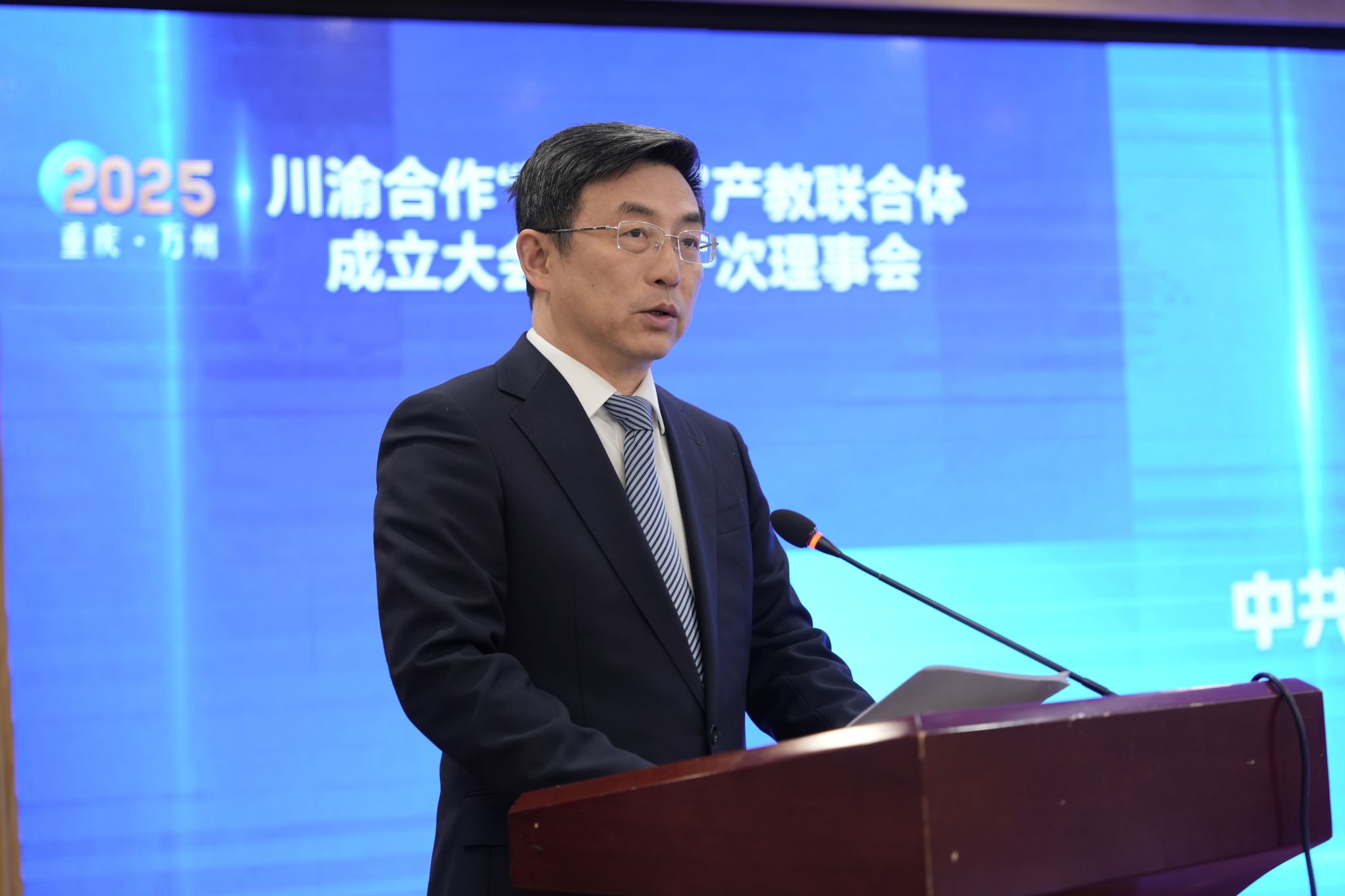 万州区政府副区长张斌作为轮值理事长发表讲话,指出联合体各单位要切实加大合作力度,全力构建协同育人新机制;要持续拓展合作深度,培育三地产业发展新动能;要延伸合作广度,推动校企地资源共享、互利共赢;呼吁多方携手以实际行动共谱创新发展新篇章。
