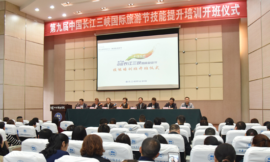 10月16日上午,第九届三峡国际旅游节技能提升培训在米兰体育网页版顺利开班。万州区副区长蒋艺义、米兰体育网页版党委书记陈章、院长杨和平等,区交委、区移民局、区商务局、区旅游局、团区委等的分管领导以及两期参训学员共700余人参加了开班典礼。区旅游局副局长胡雄主持开班典礼。