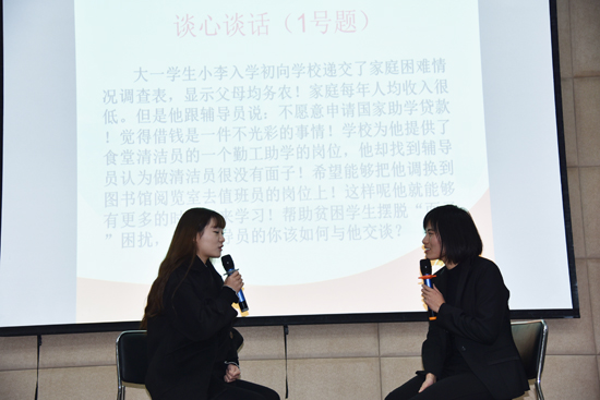 本次辅导员技能大赛共分为 “基础知识考核及网文写作”、“案例分析”、“主题演讲”和“谈心谈话”等四个环节。经过“基础知识考核及网文写作”初赛选拔,共有6名辅导员老师进入本次大赛决赛。参加决赛的赛辅导员老师备战积极、准备充分,他们精彩的表现赢得了在场评委、辅导员同行以及学生们的一致好评。