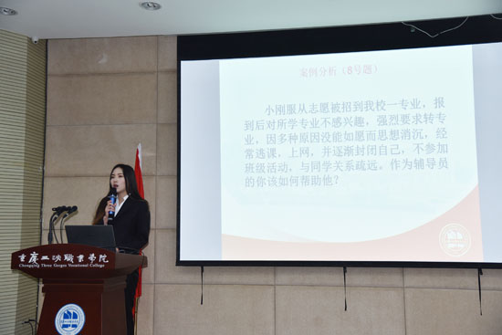 为贯彻落实党的十九大、全国和全市高校思想政治工作会议精神,切实落实好立德树人根本任务,推动《普通高等学校辅导员队伍建设规定》(教育部令第43号)、《高等学校辅导员职业能力标准(暂行)》和《普通高等学校辅导员培训规划(2013-2017年)》的有效实施,引领我院辅导员职业化、专业化发展,提高辅导员职业能力和服务水平,促进辅导员间相互交流学习和提升,选拔优秀选手参加重庆市辅导员技能竞赛,12月14日下午,米兰体育网页版第六届辅导员职业技能大赛在博雅楼207多媒体室举行。米兰体育网页版党委书记陈章、米兰体育网页版副院长杨建宏出席本次比赛。全院专兼职辅导员和部分学生代表观看了比赛。