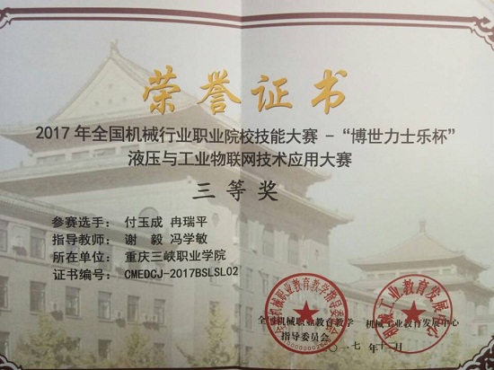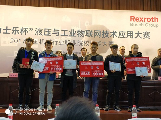 11月15日上午,从2017年全国机械行业职业院校技能大赛-“博世力士乐杯”液压与工业物联网技术应用大赛闭幕式上传来捷报,农业机械与车辆工程系谢毅和冯学敏老师指导的冉瑞平、付玉成组喜获大赛三等奖。