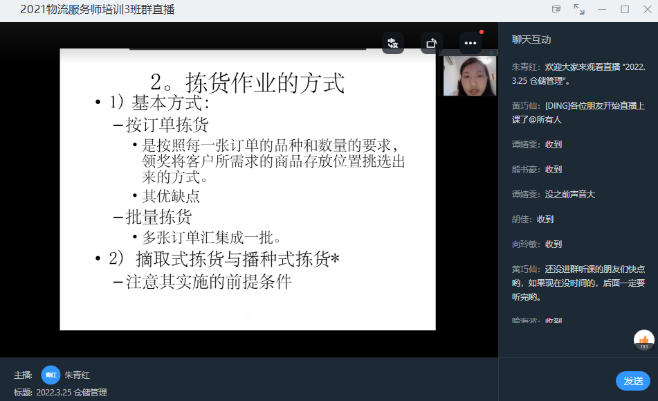 为扎实推进经济管理米兰体育网页版物流管理专业“现代学徒制”建设,保障疫情防控特殊时期校企共建课程的正常教学。3月25日,物流管理专业朱卿红老师采取线上钉钉课程教学的方式为重庆市万州铁公水联运有限公司150多名企业管理人员、基层员工作《现代物流企业仓储管理》专题培训。