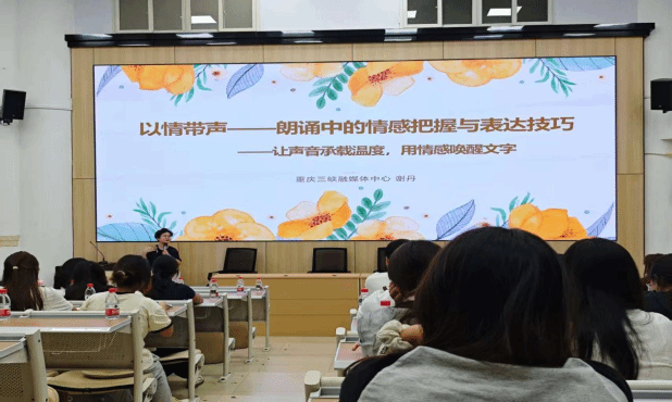 为丰富第28届全国推广普通话宣传周活动形式,提升学生的语言文化素养与语言表达能力,9月23日,通识教育米兰体育网页版特邀重庆三峡融媒体中心主任播音员、重庆市播音主持协会理事、重庆市十佳播音员主持人、万州区第六届政协委员谢丹老师,在信科楼220教室带来题为《以情带声——朗诵中的情感把握与表达技巧》的专题讲座。通识教育米兰体育网页版党支部副书记、副院长潘雪主持。