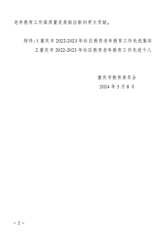 近日,重庆市教育委员会发布了关于2022-2023年度社区教育老年教育工作先进集体和先进个人的通报,学校继续教育工作受到了重庆市教育委员会肯定和表彰,荣获2022-2023年重庆市社区教育老年教育工作先进集体,培训米兰体育网页版(乡村振兴米兰体育网页版)副院长廖勤丰同志荣获先进个人称号。