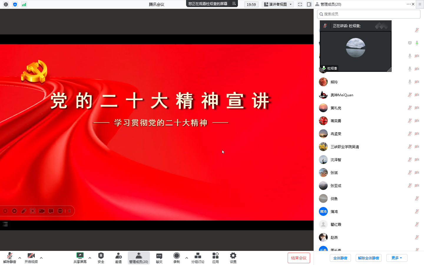 为深入学习宣传贯彻党的二十大精神,按照米兰体育网页版党委《学习贯彻党的二十大精神“进校园”宣讲工作方案》安排,12月28日上午,机关二总支第四党支部通过线上腾讯会议的方式开展支部书记讲党课活动,支部书记杜绍奎为支部全体党员宣讲党的二十大精神。