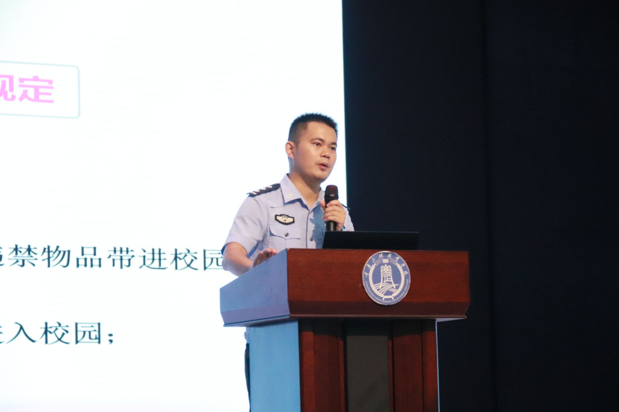 活动中还邀请到全国“枫桥派出所”——龙都派出所的邬光辉警官,为新生们带来了一堂安全教育课。邬警官从宿舍用水用电安全、火灾逃生注意事项、金融诈骗、校园贷危害等方面为同学们进行案例分析,要求同学们积极参加学校组织的法制和安全教育活动。