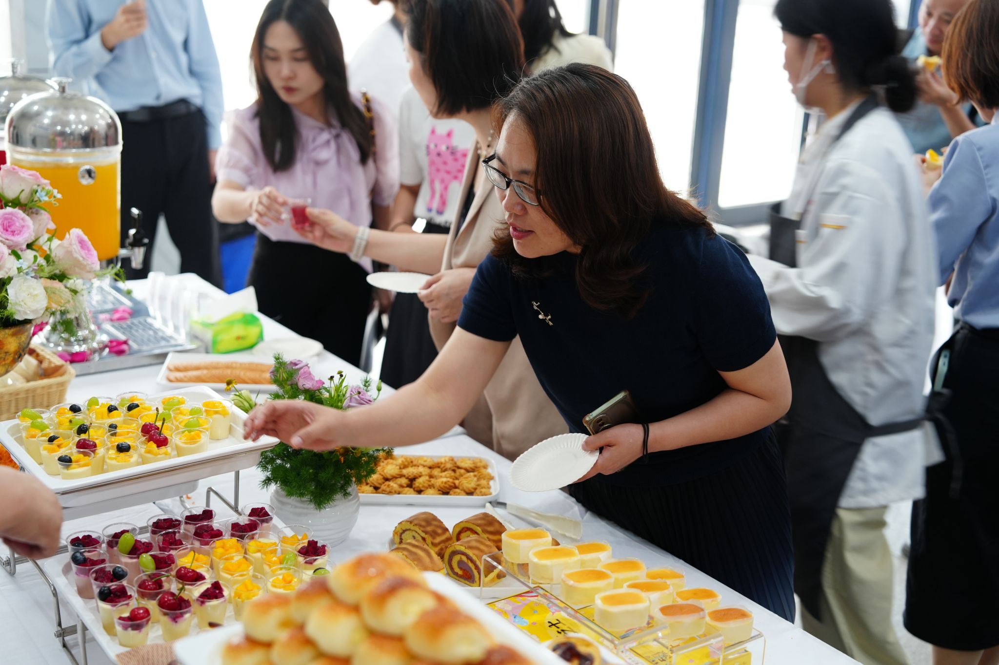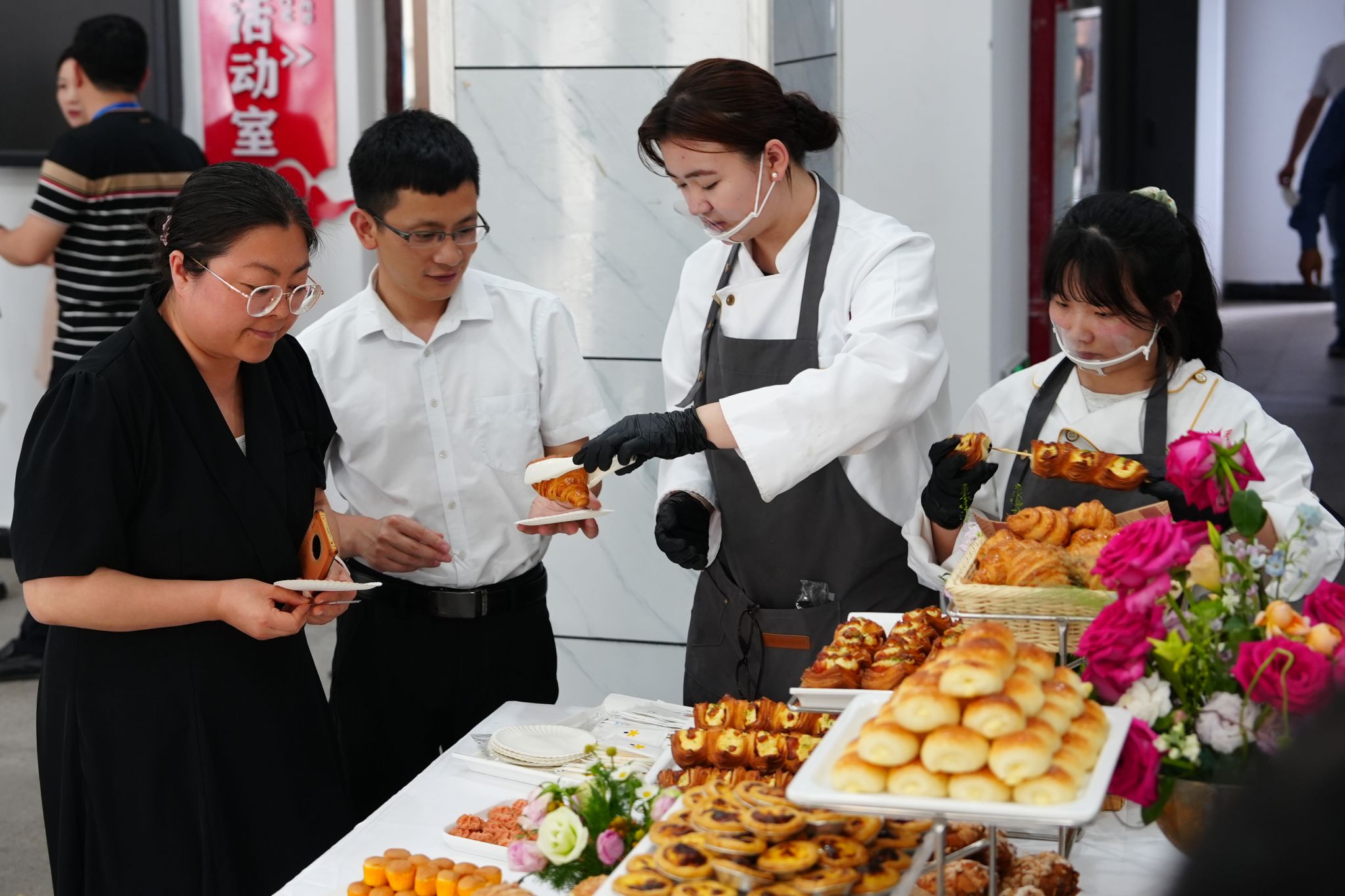 活动现场宛如一场烘焙艺术盛宴,学生代表们化身“魔法师”,将精心准备的20余件烘焙作品陈列在会场服务区,瞬间成为全场焦点。裹满肉松与香甜沙拉酱的肉松小贝,散发浓郁黄油香气焦糖色的可颂,鲜美可口的水果与甜美奶油混合的精致小杯子蛋糕……无不吸引着现场的人们,令人食指大动。