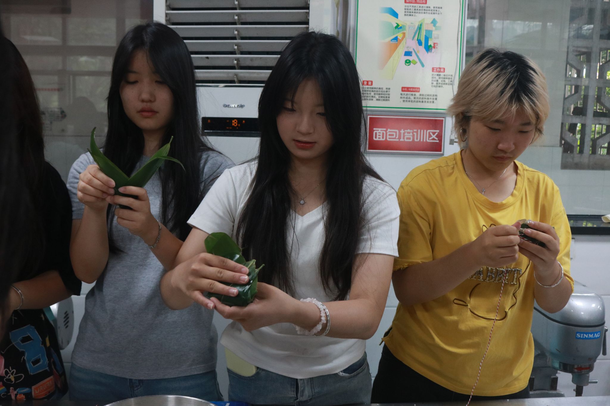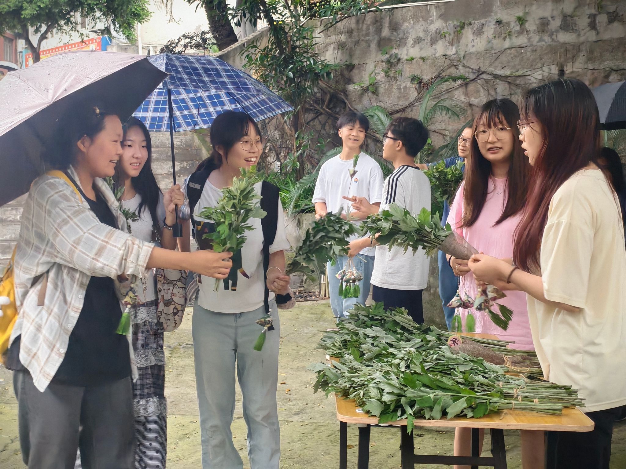 活动现场,同学们热情高涨,积极参与各项端午特色活动。在包粽子区域,大家围坐在一起,捋粽叶、填糯米、放馅料、扎紧绳,动作从生疏到熟练,一个个棱角分明的粽子在手中诞生。随后这些粽子被煮熟,散发出阵阵诱人的香气。做艾草花束的区域同样热闹非凡,同学们精心挑选艾草、菖蒲等植物,搭配上五彩丝线,巧妙地编织成一束束精美的艾草花束。此外,同学们还提前精心挑选并购买了端午香包,为活动增添了浓厚的节日氛围。