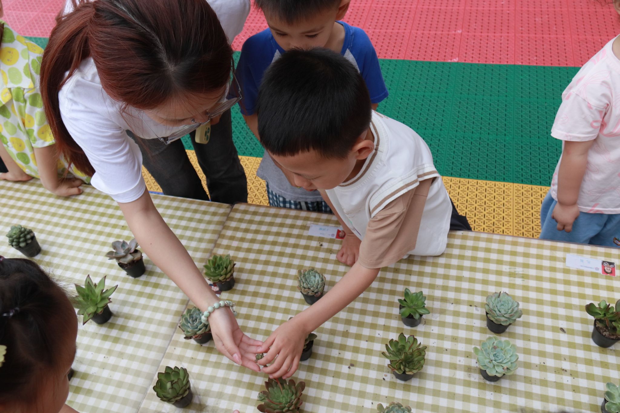 在植物标本识别环节,同学们手持枫叶、银杏叶等10余种植物标本,用生动形象的语言向小朋友们介绍植物的名称和特点。随后,小朋友们手持放大镜,分组仔细观察标本的纹理、细节,与小伙伴分享自己的发现。在昆虫标本识别环节,同学们以有趣的故事引入,如讲述破茧成蝶的故事,巧妙地引出凤蝶标本,进而介绍昆虫的生活习性和外貌特征。小朋友们围在昆虫标本旁,瞪大眼睛,充满好奇地观察蝴蝶绚丽的翅膀。在多肉植物识别环节,同学们介绍了多肉植物的特点后,带领小朋友们逐一认识观音莲、熊童子等品种。小朋友们轻轻触摸多肉的叶片,感受其独特的质感。活动中,同学们全程陪伴引导,以耐心与热情,让知识传递满是温度,使环保理念如春风化雨,悄然浸润着孩子们的心灵。