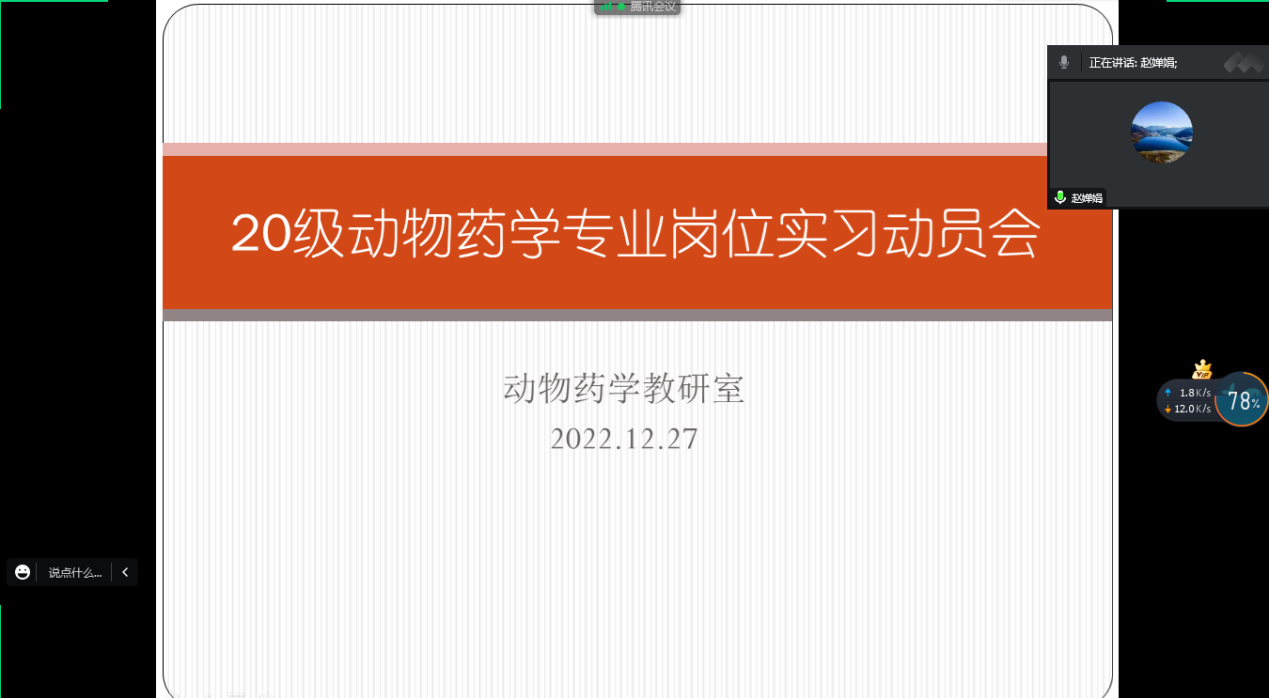 为保证2020级动物药学专业学生实习安全,让学生进一步明确实习的目的和意义。2022年12月27日,动物科技米兰体育网页版动物药学教研室召开2020级动物药学专业岗位实习动员会,动物药学专业专任教师及2020级动物药学专业全体学生参加会议,大会由动物药学专业教研室主任赵婵娟老师主持。