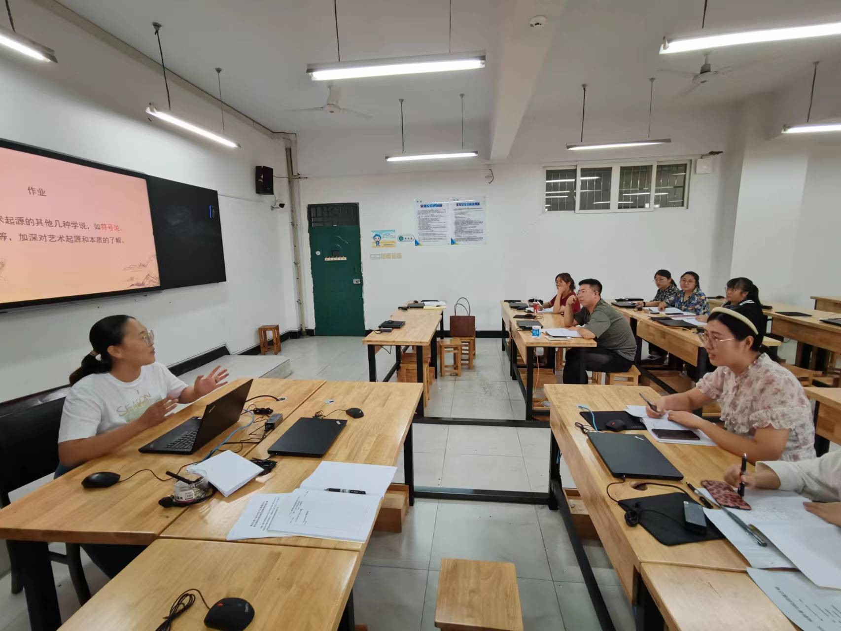 随后邓诗雨和韩晓念两位老师做备课分享。邓老师以艺术中美与丑的话题切入,通过问题导入的方式结合案例让学生思考艺术中美与丑的关系,从而引发学生对丑的思考和讨论。韩老师从说课和讲课两个方面对艺术概论的课程做了介绍。围绕为什么上这门课和怎么上这门课展开,以艺术的起源话题切入,让学生了解艺术的概念和本质。然后各位教师围绕两位老师的备课展开热烈讨论。他们对知识点的讲解、考核方式作了深入探讨,后期将围绕课程导入、知识点串联来开展第二次集体备课讨论。