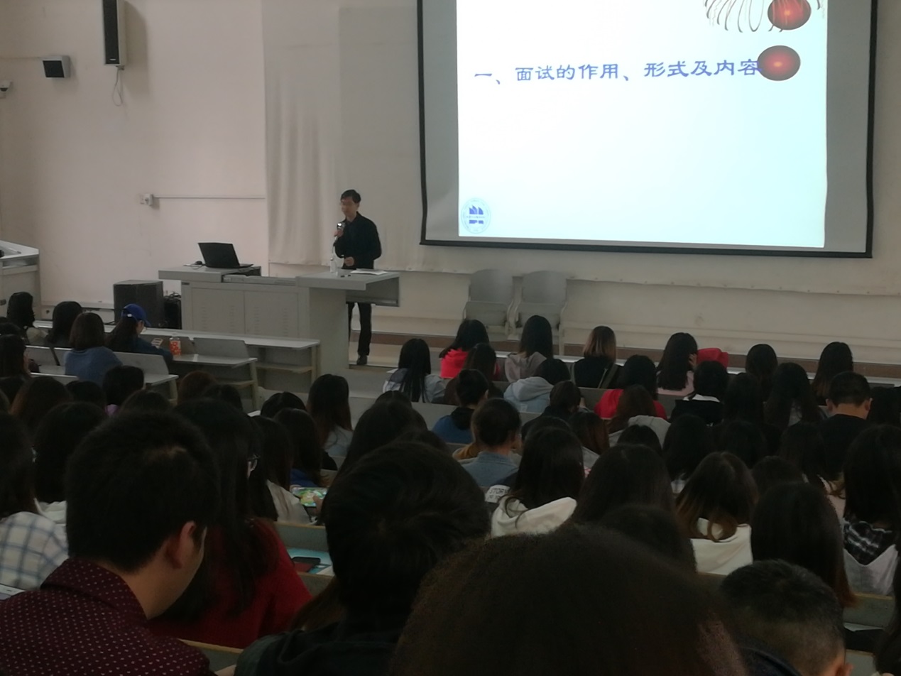 在大家热烈的掌声中,谭处以诙谐幽默的语言、饱满的热情带领大家进入了面试的世界,深入浅出地讲解了面试情境,面试礼仪,面试技巧和注意事项,进而又详细讲解了求职简历的制作,自荐信的书写等。