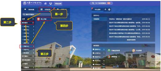 二、 登录系统后,如下依次点击:可用应用→教务服务→评教中心→网上评教,如下图所示