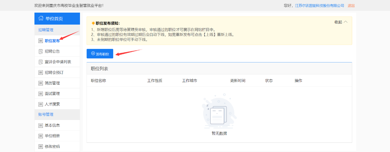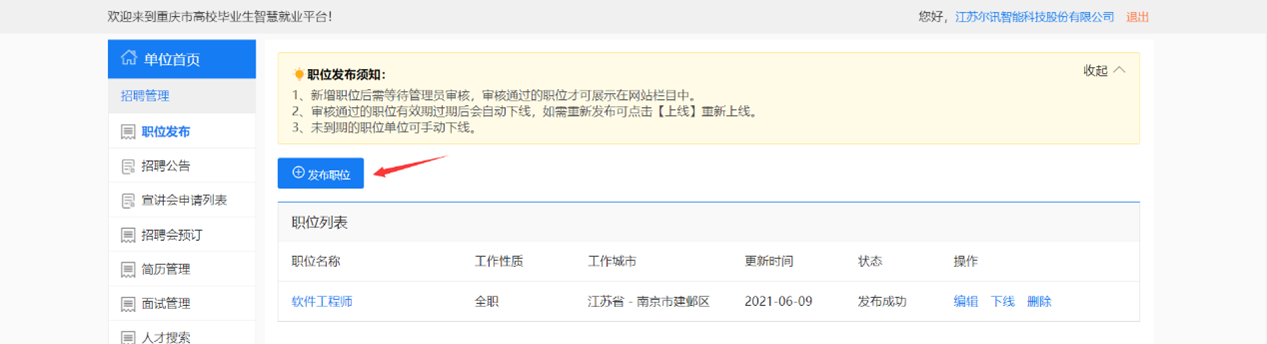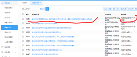 单位可在单位中心统一管理发布的职位,同一个职位,可以多次复用,在宣讲会、招聘会中只能选择已有职位;同时同一个职位可以发布到多个学校;