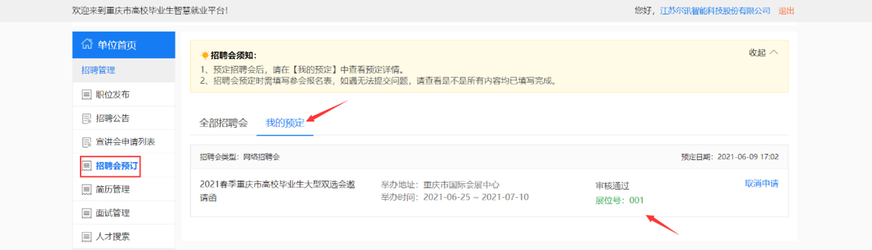 学校审核通过后,系统会给单位发送展位审核通过邮件,单位登录系统,点击【我的预定】,查看招聘会展位等信息,如图:
