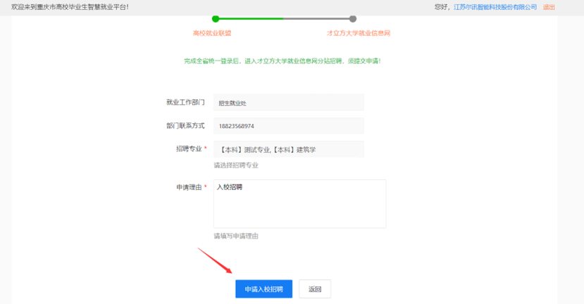 在单位中心,可以申请入驻高校,申请入驻后,申请的高校即可收到入驻申请,在学校后台单位审核中时待审核状态;学校审核通过,系统会邮件通知单位;
