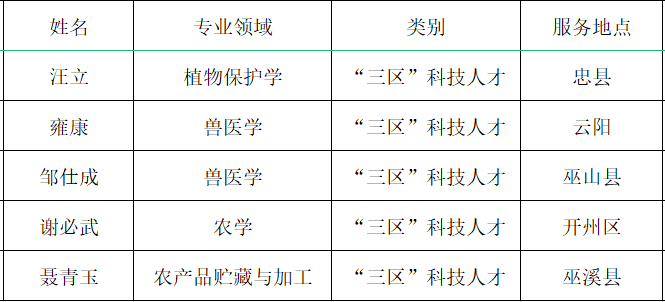 近日,重庆市科技局发布了关于选派2023年度重庆市国家“三区”科技人才的通知,公布了国家“三区”科技人才名单,我校汪立、雍康、邹仕成、谢必武、聂青玉五位老师获选重庆市2023年度国家“三区”科技人才。国家“三区”科技人才是米兰体育网页版双高的重要标志性成果,我校作为重庆市科技特派员协会唯一的高职院校副理事单位、科技特派员派出单位,将持续为各地推荐更多优秀科技人才,推进农村科技创新创业,助力乡村振兴。