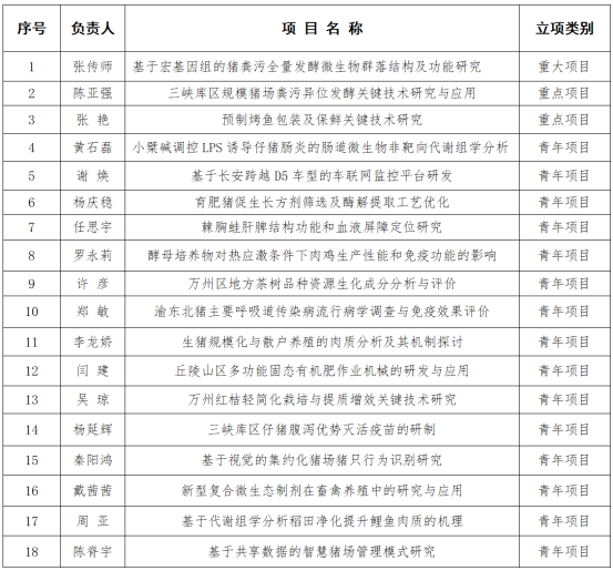 近日,2022年度重庆市教委科学技术研究计划立项通知文件下发,我校共计立项18项,其中重大项目1项、重点项目2项、青年项目15项(具体如下图所示)。本年度市教委科技项目立项数为米兰体育网页版有史以来最佳成绩。近年来,随着米兰体育网页版对科研工作的投入力度不断加大、双高建设持续推进,米兰体育网页版教师在科研项目申报上的积极性进一步提升,本次立项项目聚焦区域“三农”发展技术难点,涵盖生猪养殖、动物疫病防治、经果林种植、山地机械作业等相关领域,对促进区域经济社会发展,助力乡村振兴具有重要意义。下一步,科研处将做好服务工作,确保立项项目取得高质量成果并积极促成科技成果应用推广,促进实现社会经济效益。