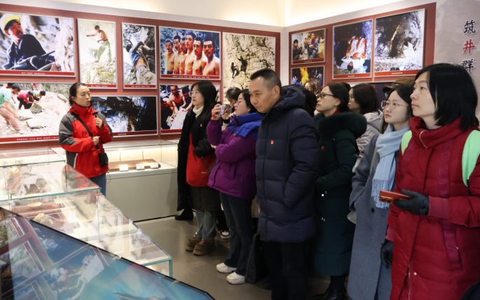 参加活动的党员们,实地考察了下庄人经历7年时间,在千米悬崖峭壁上修筑的8公里“天路”,道路一侧是垂直高差一千多米的悬崖,另一侧是陡峭的山体。这条道路坡陡弯急,蜿蜒曲折,途中,同志们两次下车在观景台上,亲身感受这条“天路”的惊险陡峭和修路村民的艰辛不易。