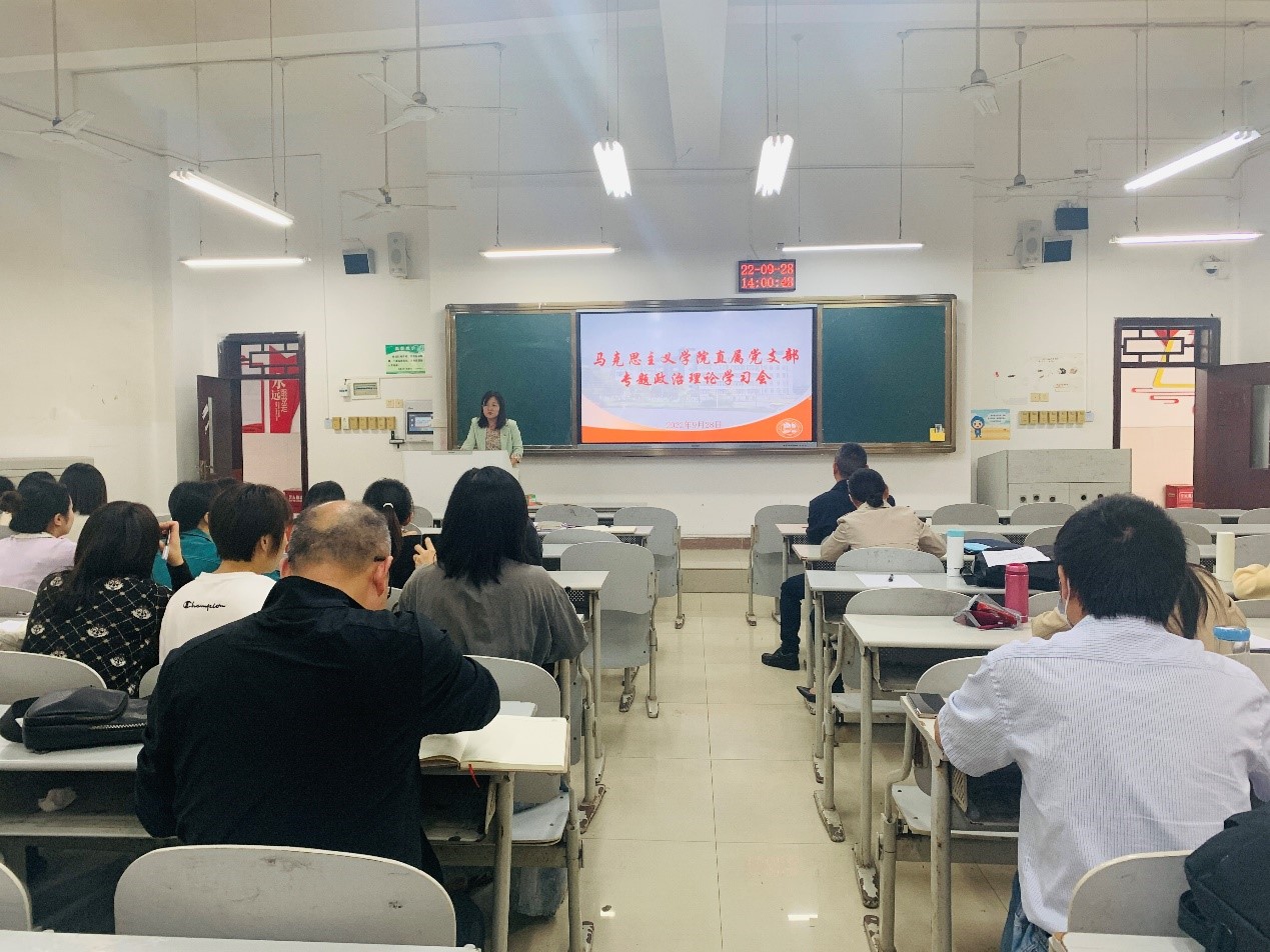 深入学习贯彻习近平总书记重要讲话精神是思政课教师提升政治素养的主渠道、主阵地,按照《中共米兰体育网页版委员会关于印发<迎接党的二十大胜利召开教职工专题政治学习实施方案>的通知》要求,9月28日下午马克思主义米兰体育网页版直属党支部全体党员聚集博雅楼108开展政治学习活动,学校党委委员、宣传部部长姜荣到会指导学习,党支部副书记丁翠娟主持学习会。为了让政治理论学习变得“有深度”“受欢迎”,马克思主义米兰体育网页版直属党支部改变了以往的做法,采取“领学+研讨+结合”的方式,让政治学习更紧密地结合实际,并指导工作。