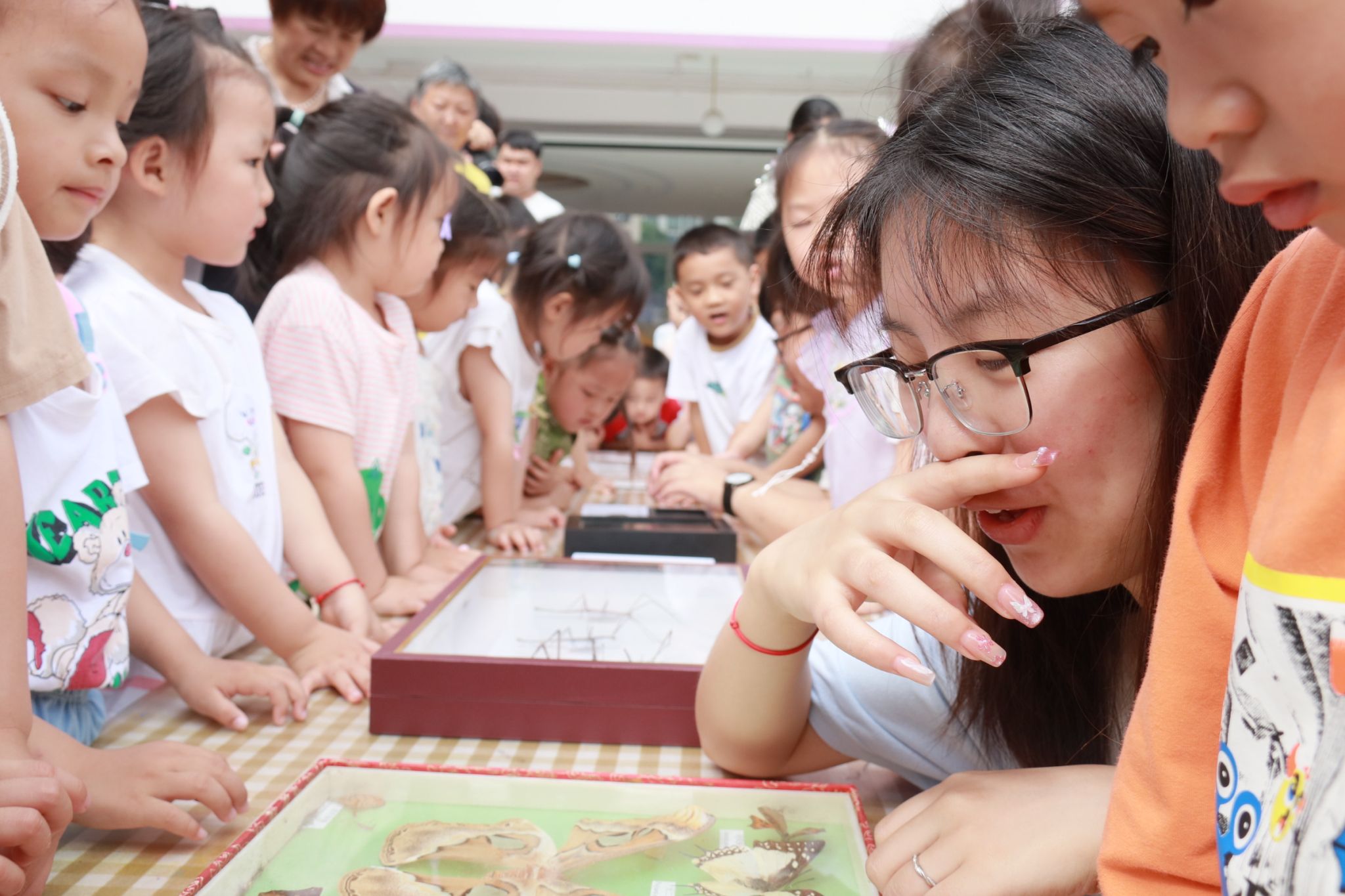 在植物标本识别环节,同学们手持枫叶、银杏叶等10余种植物标本,用生动形象的语言向小朋友们介绍植物的名称和特点。随后,小朋友们手持放大镜,分组仔细观察标本的纹理、细节,与小伙伴分享自己的发现。在昆虫标本识别环节,同学们以有趣的故事引入,如讲述破茧成蝶的故事,巧妙地引出凤蝶标本,进而介绍昆虫的生活习性和外貌特征。小朋友们围在昆虫标本旁,瞪大眼睛,充满好奇地观察蝴蝶绚丽的翅膀。在多肉植物识别环节,同学们介绍了多肉植物的特点后,带领小朋友们逐一认识观音莲、熊童子等品种。小朋友们轻轻触摸多肉的叶片,感受其独特的质感。活动中,同学们全程陪伴引导,以耐心与热情,让知识传递满是温度,使环保理念如春风化雨,悄然浸润着孩子们的心灵。