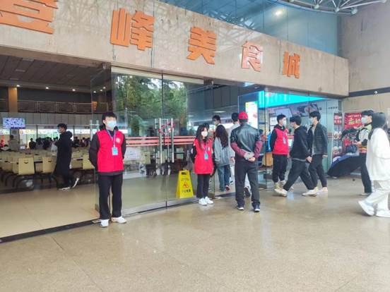 15日下午,10名优秀共青团员分批到学校男生公寓大门口、学生食堂大门口等地执勤,主要任务是对未佩戴或未正确佩戴口罩的同学进行规范提醒,力所能及帮助同学运送垃圾,搬运货物等。